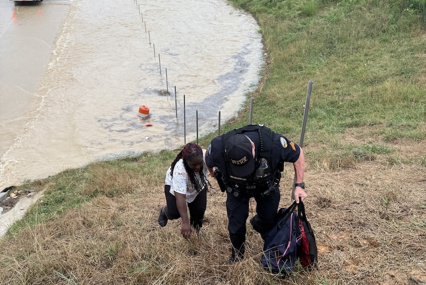 Officer Dyess carried a stranded motorist across the interstate to safety, while Officer Montana helped several people and a dog from their vehicles, also carrying luggage and guiding them to dry ground.