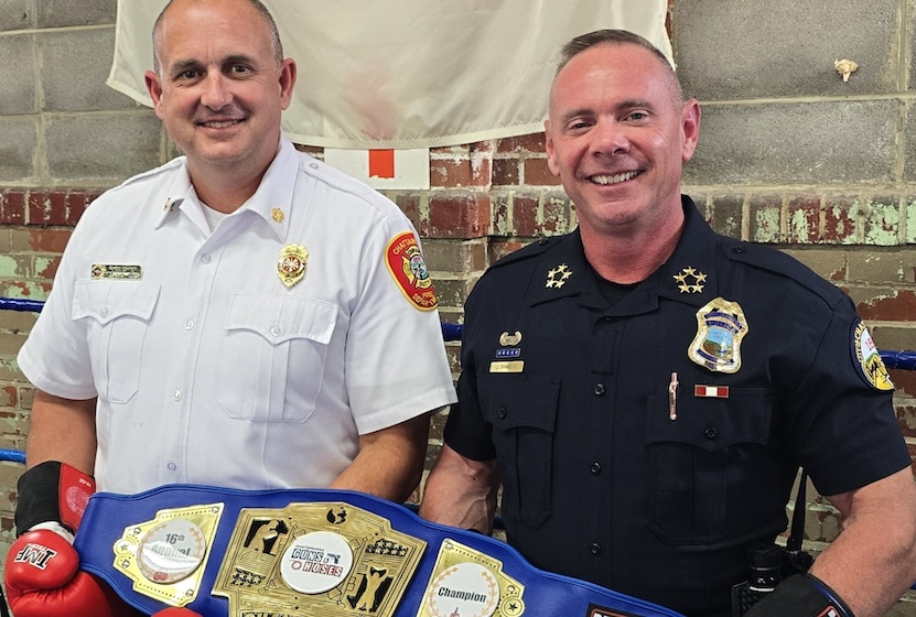 The event features a friendly boxing match between local police and fire chiefs, with Chief Chambers and Chief Knowles recently holding a brief “meeting” in the ring to promote the occasion.